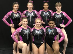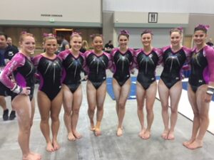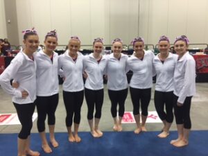 For the Senior D’s Jenna Swartzentruber lead the team by finishing 8th in the All-Around (38.275) as well as picking up two individual medals on the vault 4th with 9.75 and 5th on uneven bars 9.6. Abigail Matthews in her final competition as a JO athletes tied Swartzentruber for 5th on the uneven bars to close out her club career. Wesley Stevenson who scored over a 38 in the all around to finish 14th did break the top ten placing 10th on bars 9.525 and beam 9.45. Overall the Senior D’s had a great meet finishing in the top 3 on three of the four events and ended up 4th, just .075 away from third.