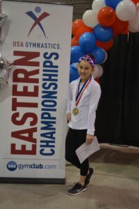 Tell us how your meet went today? Walk us through each moment of your day, warm ups, events etc… Coming into the most challenging meet I’ve been to in my entire gymnastics career, I was both nervous and excited. More than anything, I wanted to hit 4 for 4. At Regionals, I fell on bars and was still lucky enough to win, but I knew that wouldn’t be the case for Easterns. However, I also knew that this was going to be an experience that I would never forget and wanted to enjoy every moment. When I first came in and started warming up, I told my friend and Perfection teammate, Eliza Millar, who also made the Junior 6 Region 5 Team, that as long as we could get through bridges during warm up, we could do anything. Soon after we survived the hardest part of the meet, we began learning everyone else’s name on the team and getting to know one another. Our first event was beam. I was really happy with my workout on beam the previous day and was hoping I could just compete the same routine I practiced. Unfortunately that wasn’t the case. Despite having a good beam warm up, I ended up falling on my flight series– not my favorite way start a meet. I tried to stay