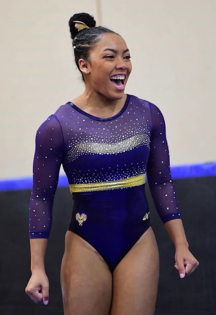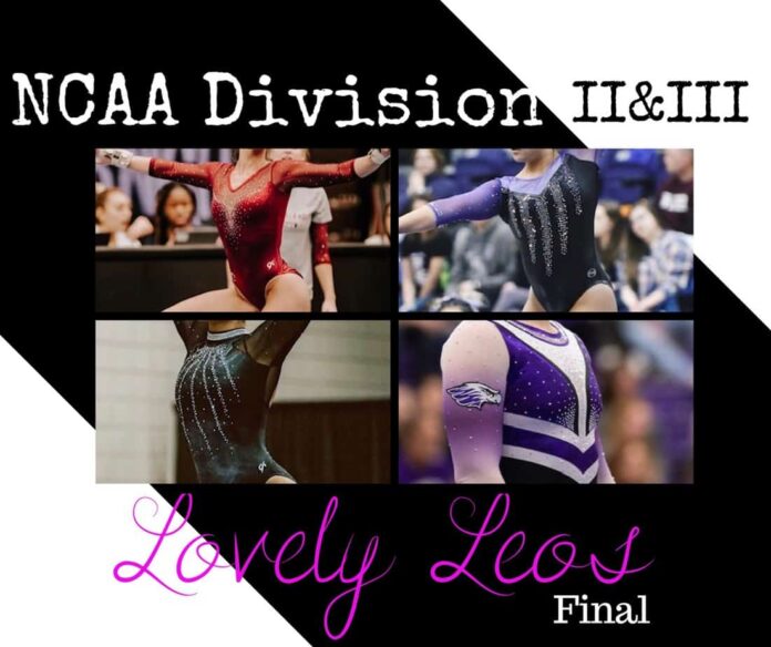 Athletes from Division II & Division III schools were all suppose to be meeting together in Ithaca, New York for a change to tumble it out for the 2020 USA Gymnastics Women’s Collegiate National Championships, instead like everyone else their season came to an end before it was suppose too. So, instead of donning their leotards for one last weekend they were all at home coaching up over ZOOM, FaceTime & Skype. What I look forward to most while viewing any gymnastics competition is the leos! Many DII & DIII schools have made our weekly NCAA Lovely Leo List in the past and since the season was cut short that means so was our weekly Leo List! So, I tirelessly searched the internet and compiled all my favorite leos from every school around the country!