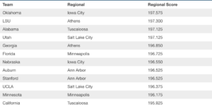 UCLA enters the championships as the 10th seed and features powerhouse vaulter and tumbler Madison Preston (Cincinnati). Madison tied for the top vault score of 9.9 at regionals. UCLA will compete in the evening semi final session.